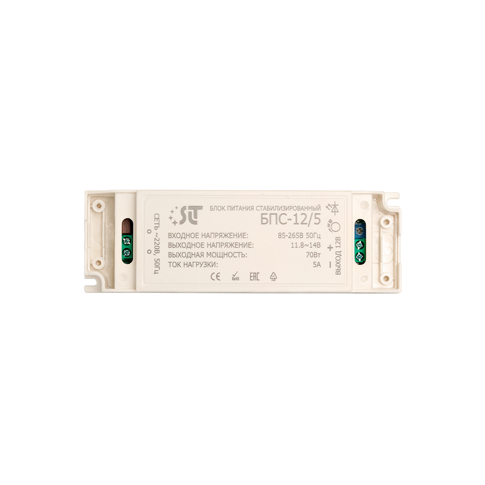 Источник питания стабилизированный; U-вх.85…265 В, U-вых.11.8…14.0 В (регулировка), I-ном.5 А; защита от перегрузок по току и короткого замыкания, индикатор режимов работы, винтовые клеммники; IP21, t-раб.-15…+50°С, 140х45х28 мм. Пластиковый корпус